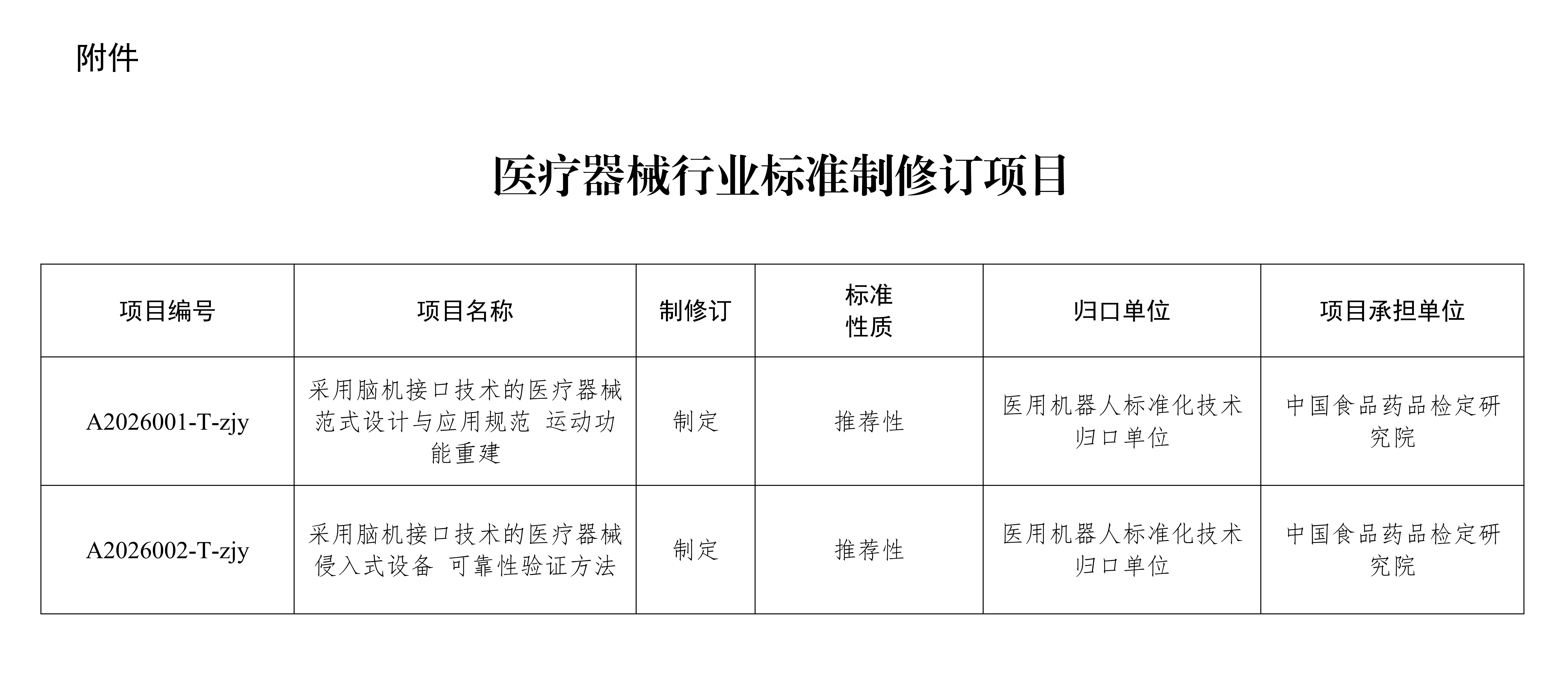 国家药监局综合司关于《采用脑机接口技术的医疗器械 范式设计与应用规范 运动功能重建》等2项医疗器械行业标准立项的通知